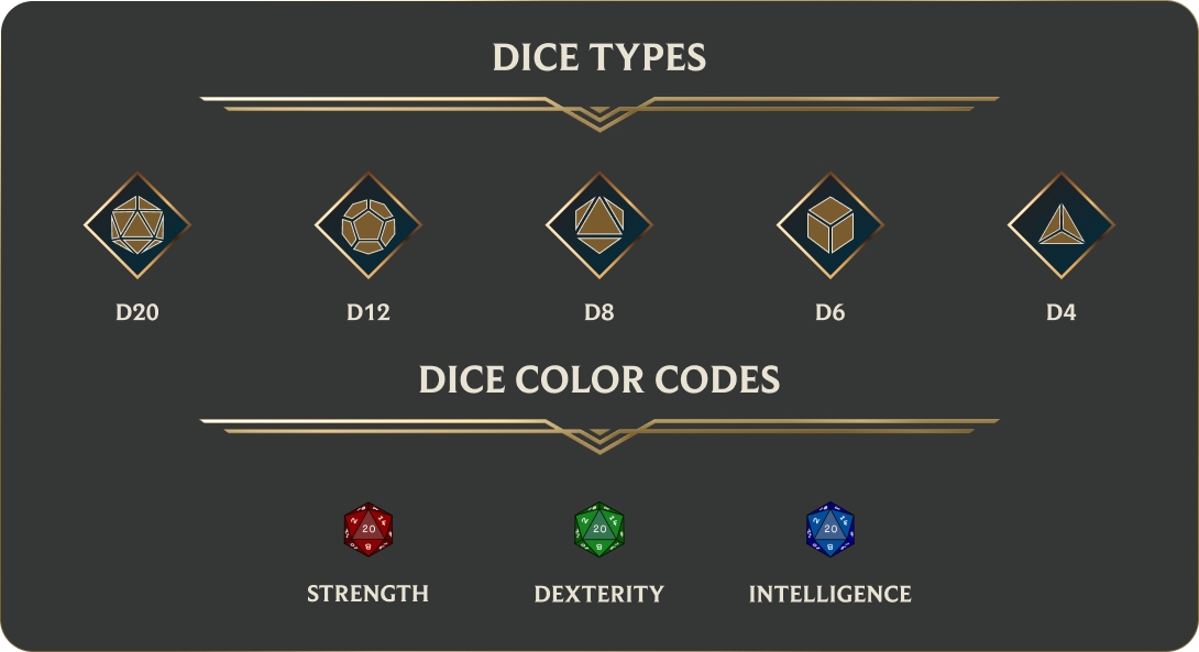 - Color Codes: Each dice color represents an action attribute type—Red for Strength, Green for Dexterity, and Blue for Intelligence.