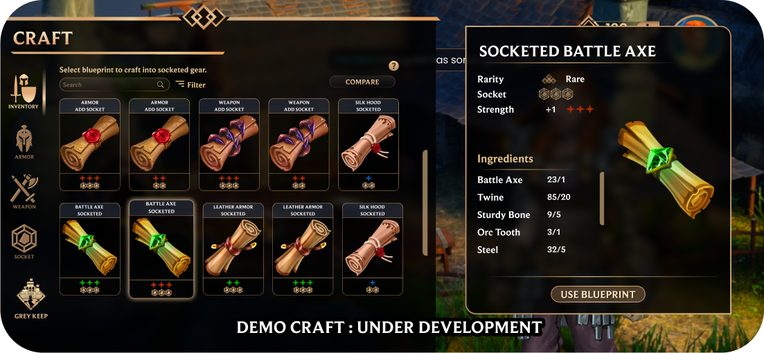 Crafting allows players to create new items, integrating strategy with the game’s economic and social frameworks. Enables the production of gear with specific attributes and bonuses, essential for customizing strategies and enhancing a player’s combat effectiveness.