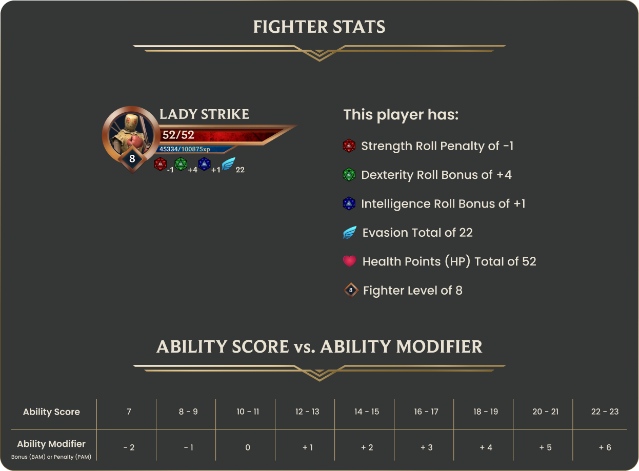 <figure><img src="https://t2288007.p.clickup-attachments.com/t2288007/82c7be33-7673-4128-a01c-39ec1ce0210b/FIGHTER%20STATS%20SCORE%20AND%20MODIFIER.png" alt=""><figcaption><p>Fighter Stat Example with Ability Score vs. Ability Modifier Chart</p></figcaption></figure>